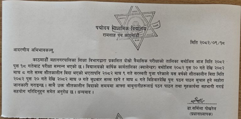 आदरणीय अभिभावकज्यू, काठमाडौँ महानगरपालिका शिक्षा विभागद्वारा प्रकाशित दोस्रो त्रैमासिक परीक्षाको तालिका बमोजिम आज मिति २०८२ पुस १८ गतेबाट परीक्षा सम्पन्न भएको छ । विद्यालयको वार्षिक कार्यतालिका (क्यालेन्डर) बमोजिम २०८२ पुस २० गते देखि २०८२ माघ ८ गते सम्म शीतकालीन बिदा भएको भएतापनि २०८२ माघ ९ गते सरस्वती पूजा परेकाले यस वर्षको शीतकालीन बिदा मिति २०८२ […]