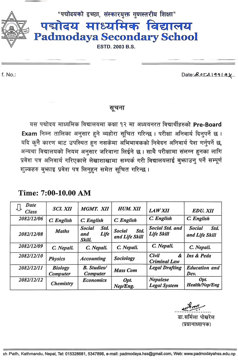 कक्षा १२ को Pre-Board Exam सम्बन्धमा